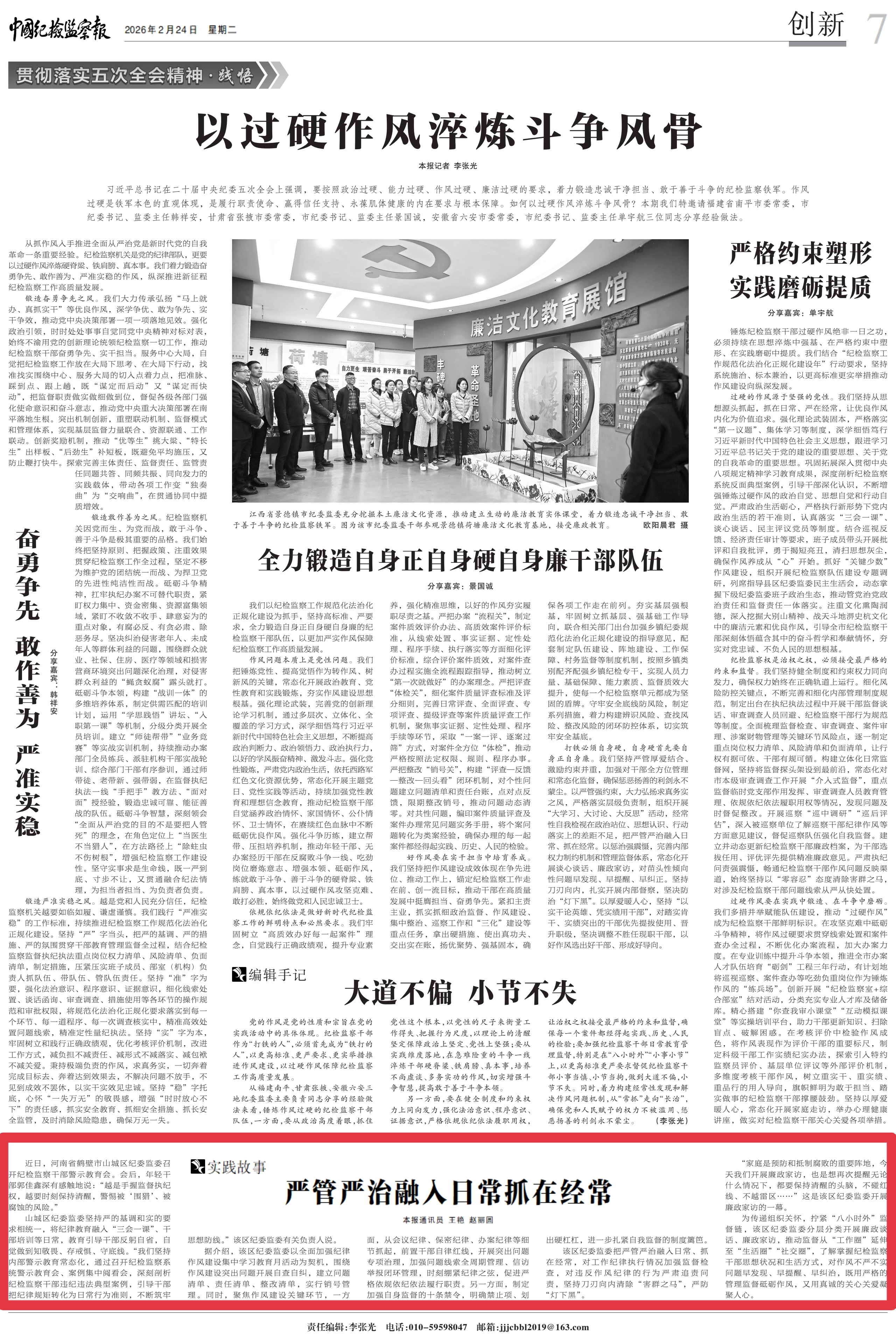 该区纪委监委把严管严治融入日常、抓在经常,对工作纪律执行情况加强监督检查,对违反作风纪律的行为严肃追责问责,坚持刀刃向内清除“害群之马”,严防“灯下黑”。