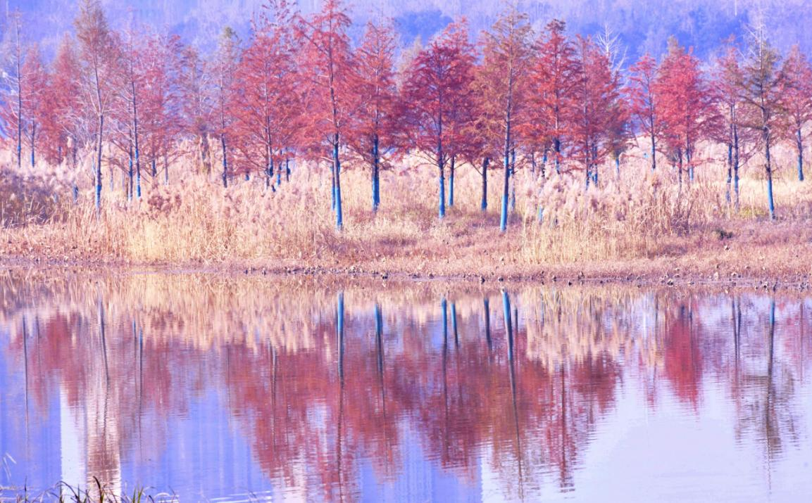 十二月,城乡一体化示范区淇水樱华园的杉树林,一改冬日沉寂,绽放出浓郁、绚烂的色彩。波光粼粼,如入梦幻之境;杉树映水,演绎光影魔术。(驻市委宣传部纪检监察组 赵永强 摄)