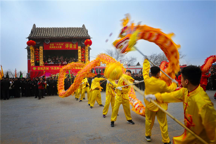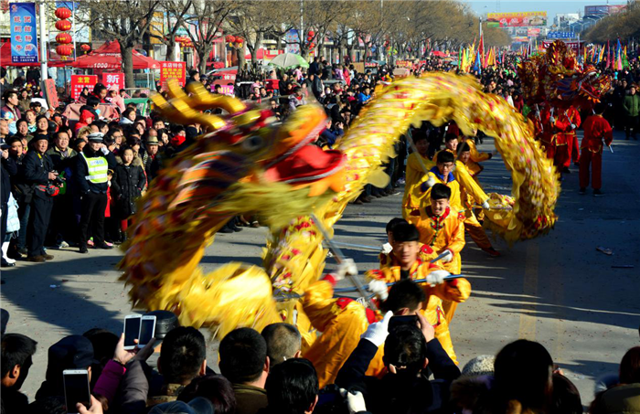 在欢乐的元宵节里,伴随着锣鼓唢呐的节奏,舞龙人统一步伐舞起龙灯,金色长龙腾空跃起,龙旋飞舞、金碧相射,引来观众们阵阵喝彩。