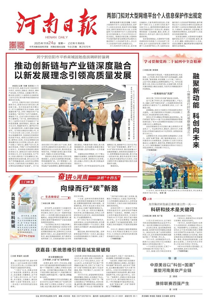 调研中,刘宁听取县区经济社会发展情况汇报,强调要牢记习近平总书记“两个更好”的殷殷嘱托,聚焦“1+2+4+N”目标任务体系,推动创新链与产业链深度融合,因地制宜发展新质生产力,持续增强绿色发展动能,着力打造一流营商环境,激发各类经营主体活力,推进作风建设常态化长效化,为奋力谱写中原大地推进中国式现代化新篇章作贡献。