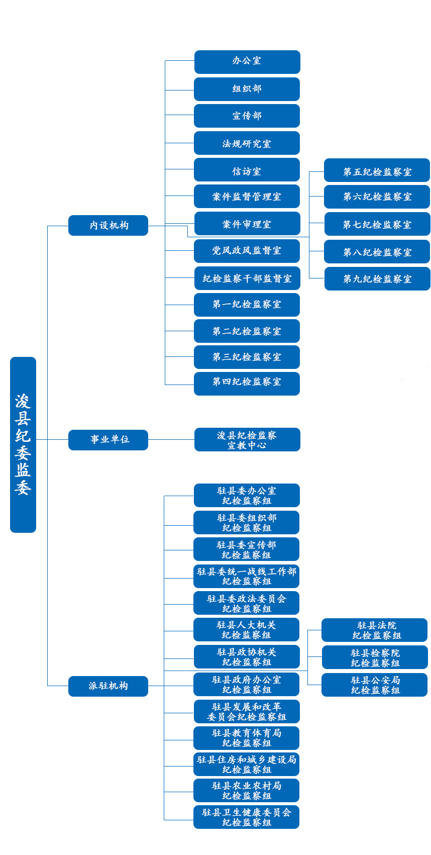 县纪委监委机关共有内设室部18个(办公室、组织部、宣传部、法规研究室、信访室、案件监督管理室、案件审理室、党风政风监督室、纪检监察干部监督室等9个综合室部,9个纪检监察室)。