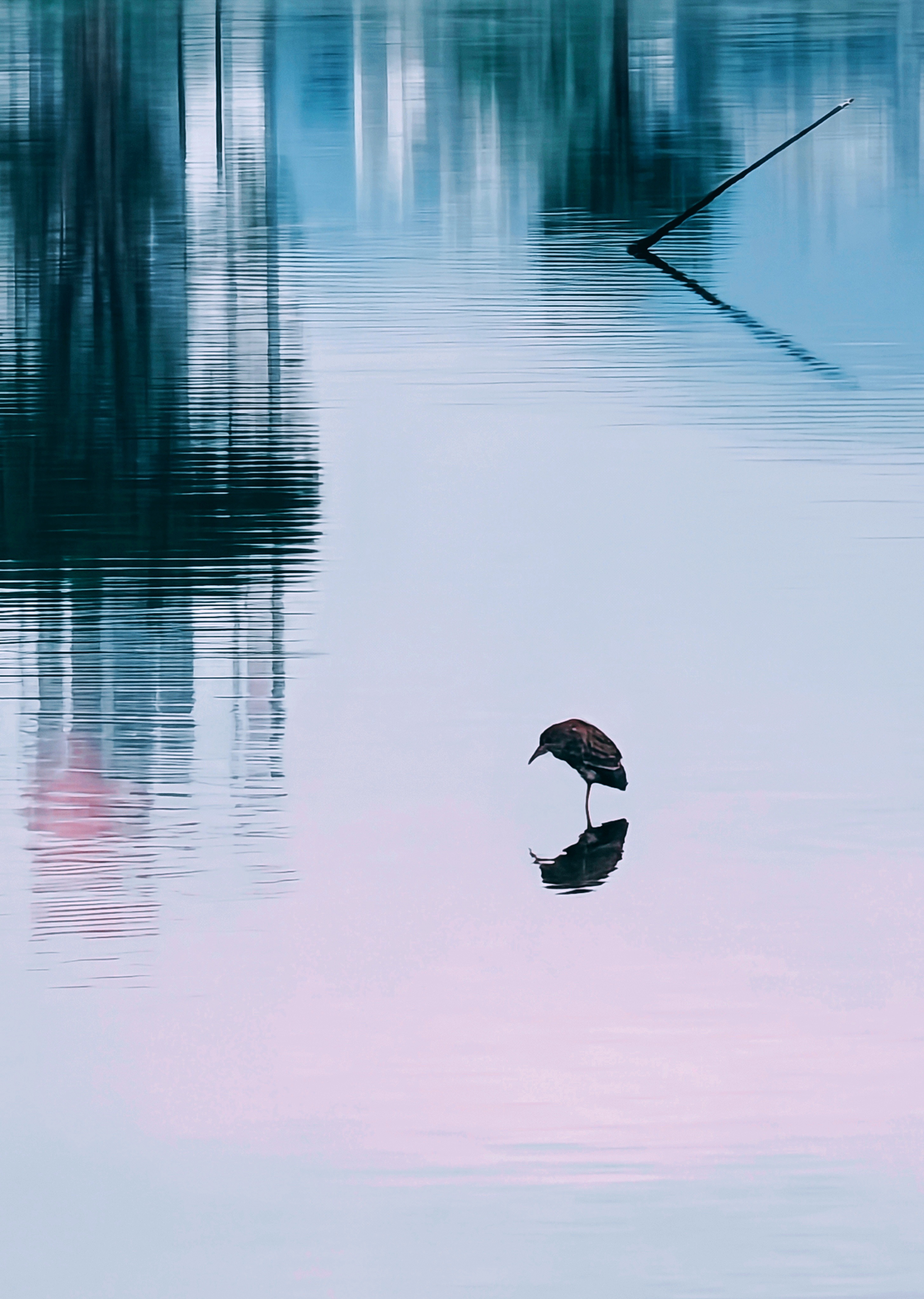在福建省厦门市海沧区水秀公园,一只池鹭静立水中,低头与倒影相映,岸边树影朦胧,恍若一幅浑然天成的油画。(福建省厦门市海沧区纪委监委供 宋菁 摄)