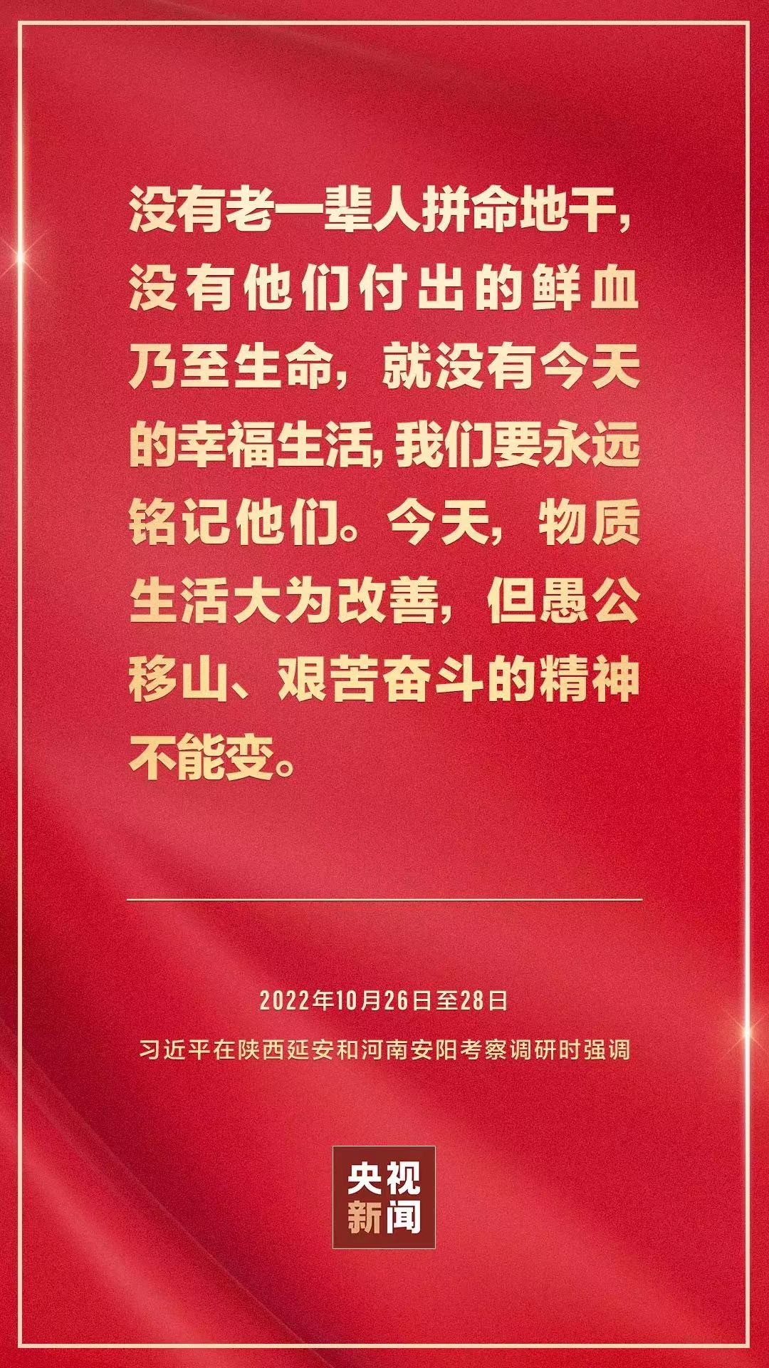 “一个时代有一个时代的主题,一代人有一代人的使命。新长征路上,每一个中国人都是主角、都有一份责任。让我们大力弘扬愚公移山精神,大力弘扬将革命进行到底精神,在中国和世界进步的历史潮流中,坚定不移把我们的事业不断推向前进,直至光辉的彼岸。”