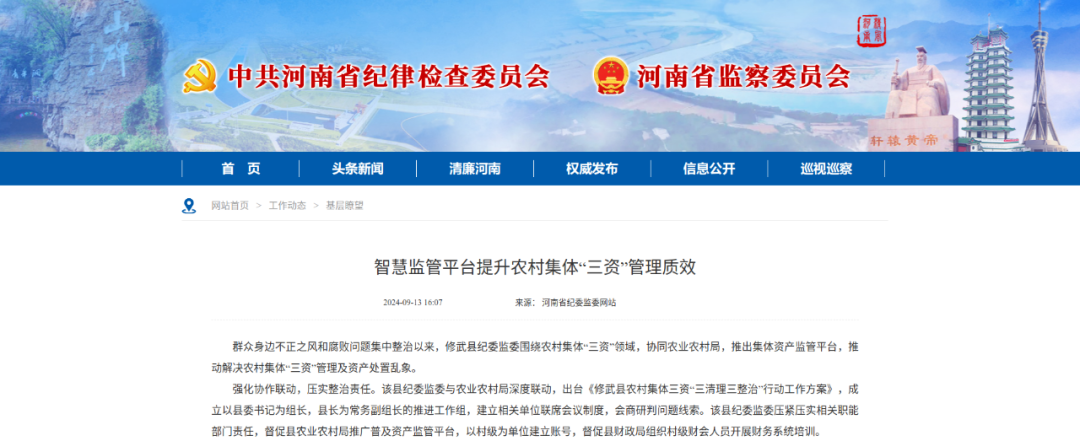 群众身边不正之风和腐败问题集中整治以来,修武县纪委监委围绕农村集体“三资”领域,协同农业农村局,推出集体资产监管平台,推动解决农村集体“三资”管理及资产处置乱象。
