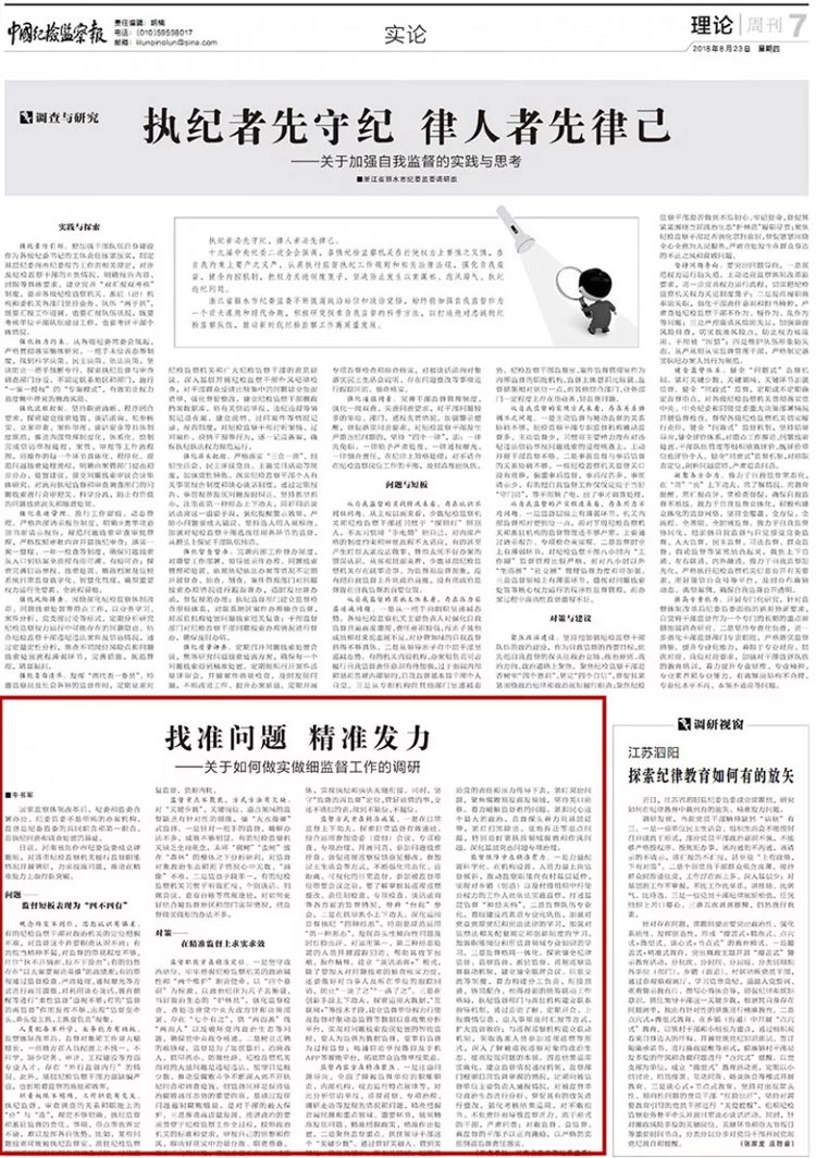 8月21日,《中国纪检监察报》关注报道我市强化纪检监察干部自身建设工作经验做法。8月23日,《中国纪检监察报》《河南日报农村版(清风中原专版)》 分别刊发市委常委、市纪委书记、市监察委主任牛书军署名文章。