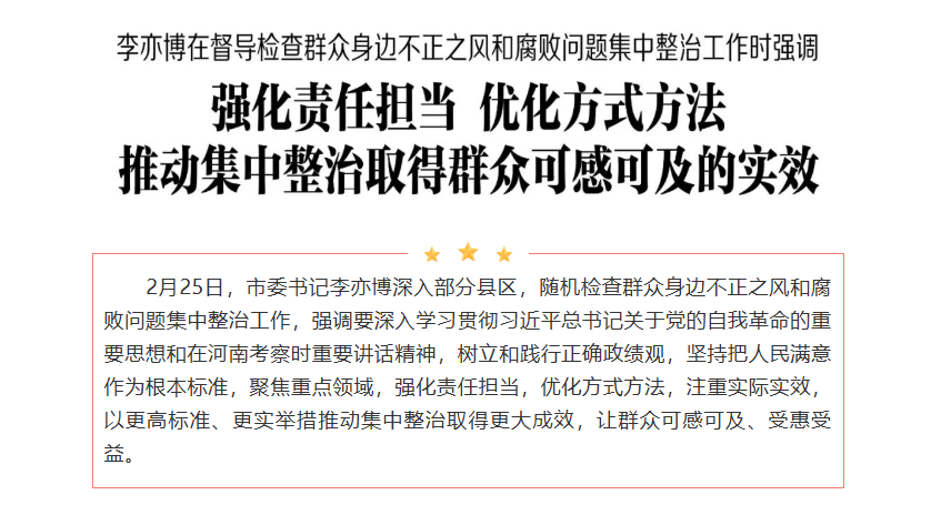 在高新区南霍村,李亦博走进田间地头,实地察看高标准农田机井建设使用现状,与村干部、农户交谈了解设施日常管护、运行实效等情况,强调要严格对照“六有”标准,紧贴农村群众实际需要,从严从实开展问题排查整改,完善建管长效机制,促进高标准农田机井设施安全高效运行,更好方便群众春季田管和农业生产。纪检监察机关和农业农村部门要坚持全面、深入、准确原则,创新运用专业化、科学化方式,聚力从发现的具体问题中深挖症结根源,研究制定便民惠农措施,有针对性改进提升工作,推动集中整治更加深入人心、惠及于民。