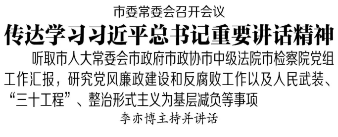1月23日,市委常委会召开会议,传达学习习近平总书记在二十届中央纪委五次全会和中央政治局常委会会议上的重要讲话精神,听取市人大常委会、市政府、市政协、市中级法院、市检察院党组2025年工作汇报,研究党风廉政建设和反腐败工作以及人民武装、“三十工程”、整治形式主义为基层减负等事项。市委书记李亦博主持并讲话。