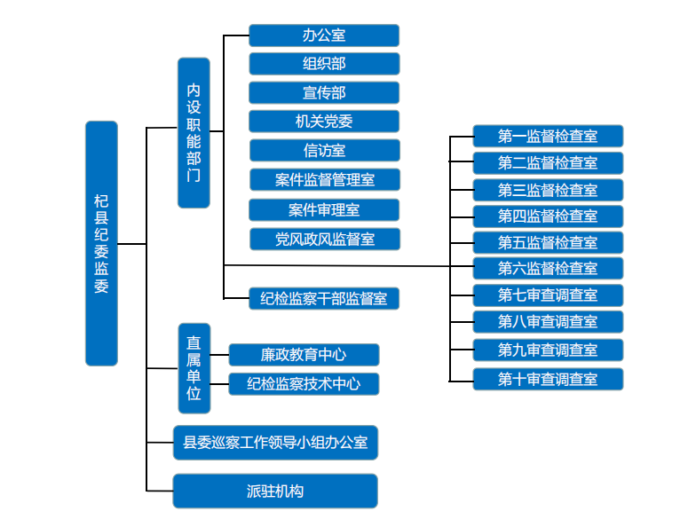 1.办公室:负责机关日常运转工作;筹备组织重要会议、活动;组织起草县纪委监委有关综合业务文件文稿;督促检查有关工作部署的落实情况等。负责机关后勤管理和服务工作,负责机关及直属单位财务管理、国有资产管理、房管基建和安全保卫工作;负责机关及派驻机构涉案款物保管等;负责机关干部职工医疗和卫生防疫工作等。