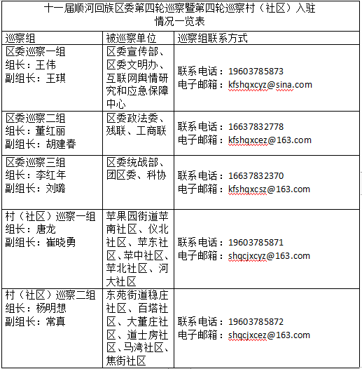 本轮共组建5个巡察组,采取“1托N”的方式,区委巡察一组对区委宣传部、区委文明办、互联网舆情研究和应急保障中心开展常规巡察,二组对区委政法委、残联、工商联开展常规巡察,三组对区委统战部、团区委、科协开展常规巡察;区委巡察村(社区)一组对苹果园街道6家社区党组织、区委巡察村(社区)二组对东苑街道6家社区党组织开展巡察村(社区)工作。巡察时间为2023年6月9日至7月23日,为期45天。各巡察组均开通并公布接收举报和反映情况的联系电话、接收短信手机、电子邮箱。巡察组受理信访举报时间为工作日工作时间。巡察结束后,信访渠道自行关闭。