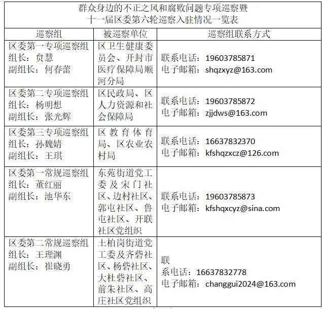 本次共组建5个巡察组,采取“一托二”和街道社区“一体巡”的方式,区委第一专项巡察组对区卫生健康委员会、开封市医疗保障局顺河分局开展巡察;区委第二专项巡察组对区民政局、区人力资源和社会保障局开展巡察;区委第三专项巡察组对区教育体育局、区农业农村局开展巡察;区委第一常规巡察组对东苑街道党工委及宋门社区、边村社区、郭屯社区、鲁屯社区、开联社区党组织开展巡察;区委第二常规巡察组对土柏岗街道党工委及齐砦社区、杨砦社区、大杜砦社区、前朱社区、高庄社区党组织开展巡察。专项巡察时间为2024年5月23日至6月17日,为期25天。常规巡察时间为2024年5月23日至7月22日,为期60天。巡察组开通并公布接收举报和反映情况的联系电话、接收短信手机、电子邮箱。巡察组受理信访举报时间为工作日工作时间。巡察结束后,信访渠道自行关闭。(来源:区委巡察办)