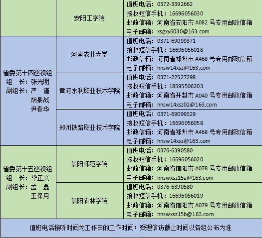 据悉,本轮巡视时间60天左右,巡视期间设置专门值班电话和专用邮政信箱等,主要受理反映被巡视党组织领导班子及其成员、下一级党组织领导班子主要负责人和重要岗位领导干部问题的来信来电来访。巡视期间,省委巡视组将严格落实中央八项规定及其实施细则精神和省委相关规定,主动接受被巡视对象和社会各界的监督,省纪委监督举报电话12388,省委组织部监督举报电话12380。(刘勰 崔文)