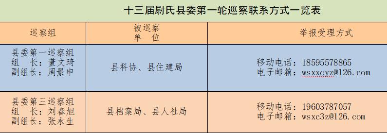 巡察期间,各巡察组均开通举报电话、电子邮箱,在被巡察单位设立举报信箱,接受群众来电来信来访。巡察组受理的时间为工作日上午8:30至下午6:00。受理截止日期为12月23日。对不属于巡察受理范围的事项,按规定转交有关部门处理。(尉氏县委巡察办  王卫河)