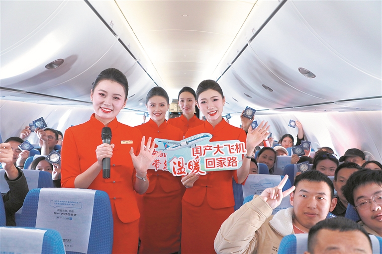 坐上“自家”大飞机,温暖与心安同行。“愿C919国产大飞机承载着每一位家人的期盼,伴随诸位穿越云海,飞向美好未来。”航班上,乘务组通过客舱广播向机上旅客致意;广州白云国际机场南航值机柜台前,“国产大飞机温暖回家路”的手举牌吸引旅客们驻足合影留念;飞行旅途中,乘务员与旅客们热情互动,共同庆祝国产大飞机亮相春运……“此心安处是吾乡”,航班上宾至如归的服务,让“家”的时空距离此刻仿佛缩短了。