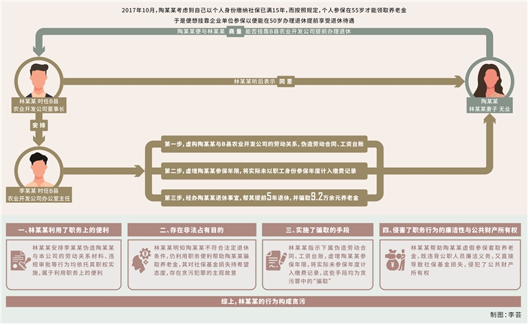 贪污罪。2017年10月,林某某妻子陶某某(无业,另案处理)考虑到自己以个人身份缴纳社保已满15年,而按照规定,个人参保在55岁才能领取养老金,于是便想挂靠企业单位参保,以便能在50岁办理退休、提前享受退休待遇。基于此,陶某某便与林某某商量能否挂靠B县农业开发公司提前办理退休,林某某听后表示同意,并利用担任该公司董事长的职务便利,在明知陶某某不符合提前退休条件的情况下,安排时任公司办公室主任李某某(另案处理)虚构劳动关系,为陶某某以该公司职工身份办理退休事宜。手续办理过程中,李某某按林某某的安排,伪造B县农业开发公司与陶某某的《劳动合同书》,经林某某本人签字后加盖公司合同专用章,陶某某凭该合同在B县人力资源和社会保障局进行劳动合同鉴证。完成鉴证后,陶某某顺利以B县农业开发公司职工身份参保,当年度公司为其缴纳职工养老保险、工伤保险、失业保险、医疗保险共计7649.76元。其间,陶某某从未在B县农业开发公司上班,也未向公司补缴为其缴纳的社保费用。