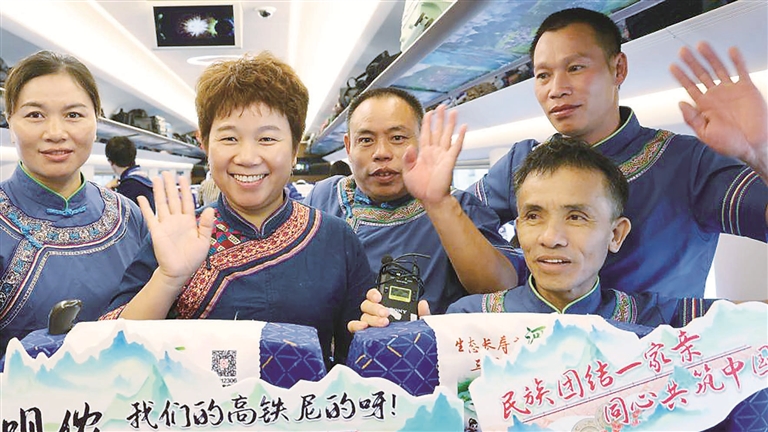 2023年8月31日,毛南族群众在车厢内欢庆贵南高铁全线贯通运营。 资料图片
