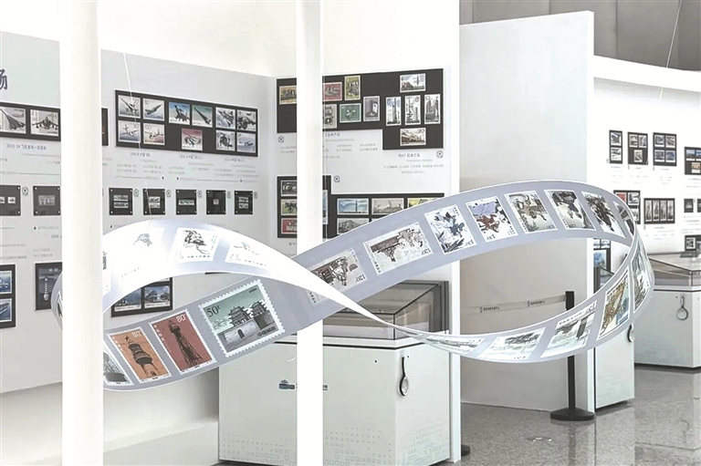 空中,一个莫比乌斯环轻盈扭转、连绵相接,铺展成永无止境的曲面,一枚枚承载科技记忆的邮票贴合其上,宛若一条流淌的科学长河,穿越时空,贯通古今。