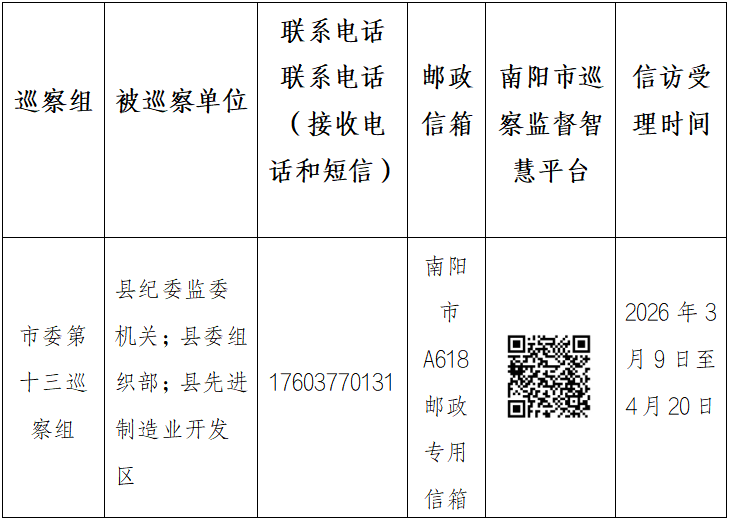 据悉,本次巡察时间45天左右。其间,设立专门值班电话、接收短信手机、邮政信箱等信访举报方式,主要受理反映被巡察党组织领导班子及其成员、二级单位负责人、内设科室(部门)负责人和重要岗位干部问题的来信来电来访,重点是关于违反政治纪律、组织纪律、廉洁纪律、群众纪律、工作纪律和生活纪律等方面的举报和反映。在此之外,专门开通“南阳市巡察监督智慧平台”,广大干部群众可以直接扫描二维码反映情况。