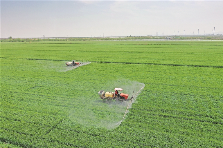 近日,在安徽省宿松县省属农垦华阳河农场,工人驾驶高架宽幅喷杆打药机对小麦实施“一喷三防”作业,全面防控小麦赤霉病。图片来源:视觉中国