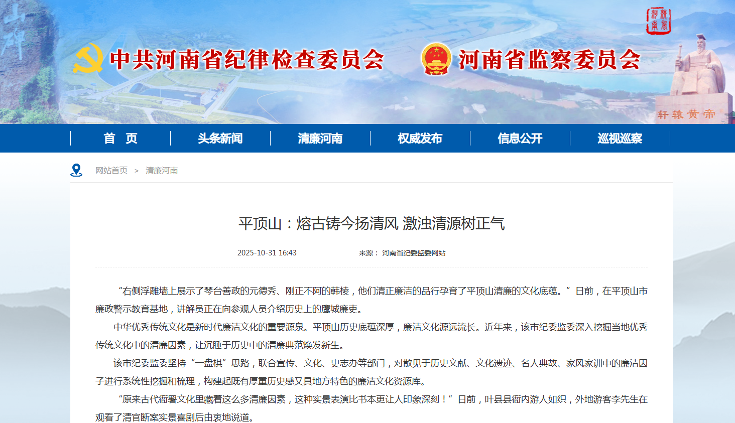 中华优秀传统文化是新时代廉洁文化的重要源泉。平顶山历史底蕴深厚,廉洁文化源远流长。近年来,该市纪委监委深入挖掘当地优秀传统文化中的清廉因素,让沉睡于历史中的清廉典范焕发新生。