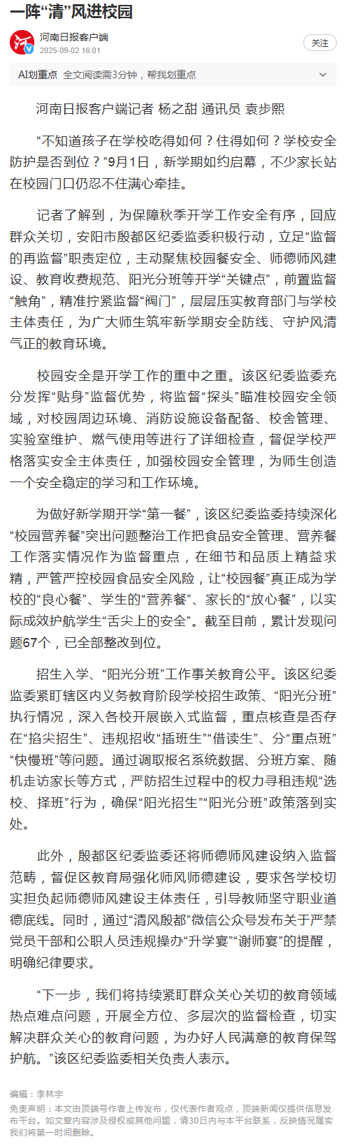 记者了解到,为保障秋季开学工作安全有序,回应群众关切,安阳市殷都区纪委监委积极行动,立足“监督的再监督”职责定位,主动聚焦校园餐安全、师德师风建设、教育收费规范、阳光分班等开学“关键点”,前置监督“触角”,精准拧紧监督“阀门”,层层压实教育部门与学校主体责任,为广大师生筑牢新学期安全防线、守护风清气正的教育环境。