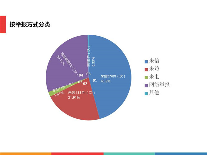 从举报方式上看,来信278件(次),占比45.8%;来访133件(次),占比21.91%;来电11件(次),占比1.81%;网络举报183件(次),占比30.15%;其他2件(次),占比0.33%;分列前三位的来信、网络、来访占总量的97.86%。