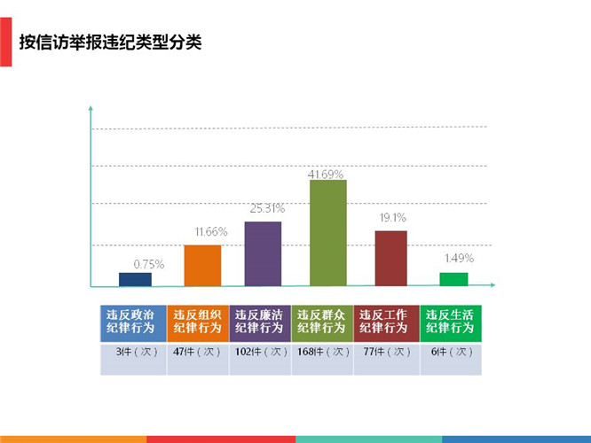 从信访举报违纪类型来看,违反政治纪律行为3件(次),占0.75%;违反组织纪律行为47件(次),占11.66%;违反廉洁纪律行为102件(次),占25.31%;违反群众纪律行为168件(次),41.69%;违反工作纪律行为77件(次),占19.1%;违反生活纪律行为6件(次),占1.49%。