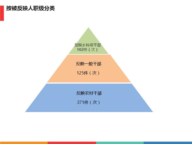 从被反映人职级来看,反映乡科级干部102件(次);反映一般干部125件(次);反映农村干部371件(次)。