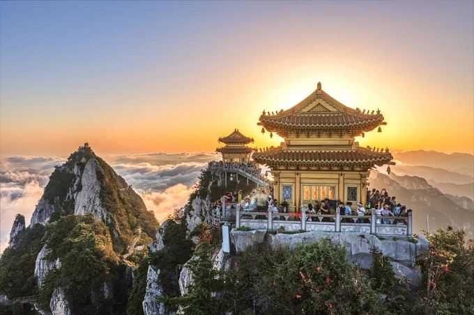 海阔天空云翻涌,落日熔金映群山。秋分时节,洛阳市老君山群峰竞秀,宛如在云海之间沉浮不定。游客们攀上金顶,尽情领略云海落日的壮美和苍翠寒山的雄奇。(洛阳市涧西区纪委监委 段万卿 摄)