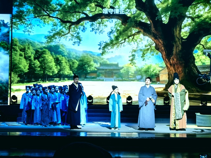 灵宝市纪委监委着力打造“暮夜却金”廉洁文化品牌,通过编排、展演一系列“四知太守”杨震相关原创文艺节目,让廉洁文化潜移默化地影响群众生活,进一步提升廉洁文化影响力、感染力。图为历史情景剧《弘农清风》在该市体育文化活动中心上演。(灵宝市纪委监委 赵圆圆 摄)