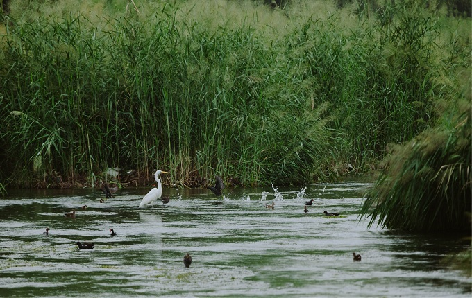 白露初凝,芦苇青郁绕碧水。水面上,白鹭静立,水鸟或划波寻食,或振翅溅起细浪,灵动鲜活。此时秋意渐浓,白鹭的清寂与水鸟的生机,织就了这方自然图景。(郑州经济技术开发区纪检监察工委 王海洋 摄)