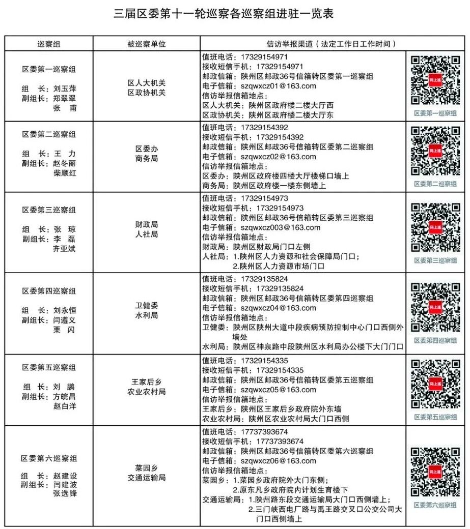 按照区委统一安排部署,三届区委第十一轮巡察安排6个巡察组,于2025年11月12日至12月26日对菜园乡党委、王家后乡党委、区委办、区人大机关、区政协机关、财政局、人力资源和社会保障局、交通运输局、水利局、农业农村局、商务局、卫生健康委员会等10家区直单位、2个乡开展巡察。根据《中国共产党巡视工作条例》规定,区委巡察组主要受理反映被巡察单位领导班子及其成员、其他科级干部、二级机构主要负责人问题的来信、来电等,重点是群众身边不正之风和腐败问题,以及违反政治纪律、组织纪律、廉洁纪律、群众纪律、工作纪律和生活纪律等方面的举报和反映。对其他不属于巡察受理范围的信访问题,将按照规定交由有关部门处理。为方便广大干部群众反映问题,现将各巡察组的信访渠道予以公布: