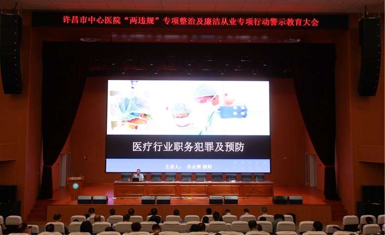 6月27日,许昌市中心医院召开“两违规”专项整治及廉洁从业专项行动警示教育大会,邀请许昌名人律师事务所乔永辉律师开展《医疗行业职务犯罪及预防》的专题讲座。党委书记王三宝、院长牛锋及其他领导班子成员参加会议,纪委书记葛培金主持会议。