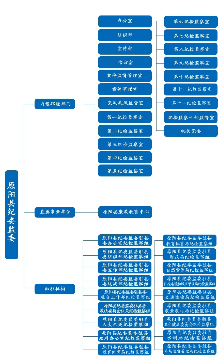 中国共产党原阳县纪律检查委员会机关与原阳县监察委员会合署办公,共有20个内设机构,分别为:办公室、组织部、宣传部、信访室、案件监督管理室、案件审理室、党风政风监督室、第一纪检监察室至第十二纪检监察室、纪检监察干部监督室,单列机关党委。所属1个事业单位:原阳县廉政教育中心(原阳县纪委监察委谈话场所保障服务中心)。实行统一管理的派驻机构18个。