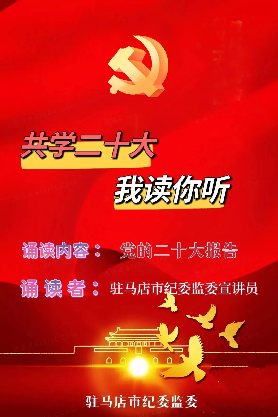 栏目简介:为深入学习宣传贯彻党的二十大精神,驻马店市纪委监委组织全市纪检监察系统宣讲员轮流诵读党的二十大报告原文,以“读”与“听”互促互动的形式,助推全市党员干部全面准确、深入理解党的二十大报告,把力量凝聚到党的二十大确定的各项任务上来,力求把党的创新理论不断转化为推动工作落实、促进事业高发展的强大动力。“共学二十大·我读你听”栏目,敬请关注!