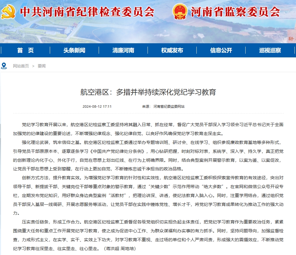 创新方式方法,提升教育实效。为增强党纪学习教育的针对性和实效性,航空港区纪检监察工委积极探索宣传教育的有效途径,突出对领导干部、新提拔干部、关键岗位干部等重点对象的警示教育,通过“关键少数”示范作用带动“绝大多数”。在官网和微信公众号开设专栏,定期发布党纪知识,用好群众身边典型案例“活教材”,把理论讲深、讲透,使纪法教育入脑入心。同时,注重学用结合,通过组织党员干部深入基层一线调研、开展志愿服务等活动,让党员干部在实践中锤炼党性、增长才干,将党纪学习教育成果转化为推动工作的强大动力。