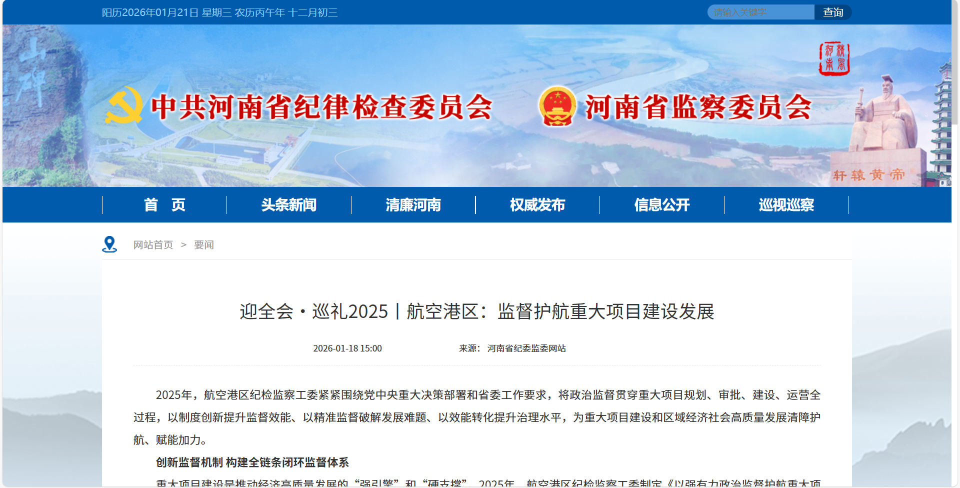 2025年,航空港区纪检监察工委紧紧围绕党中央重大决策部署和省委工作要求,将政治监督贯穿重大项目规划、审批、建设、运营全过程,以制度创新提升监督效能、以精准监督破解发展难题、以效能转化提升治理水平,为重大项目建设和区域经济社会高质量发展清障护航、赋能加力。